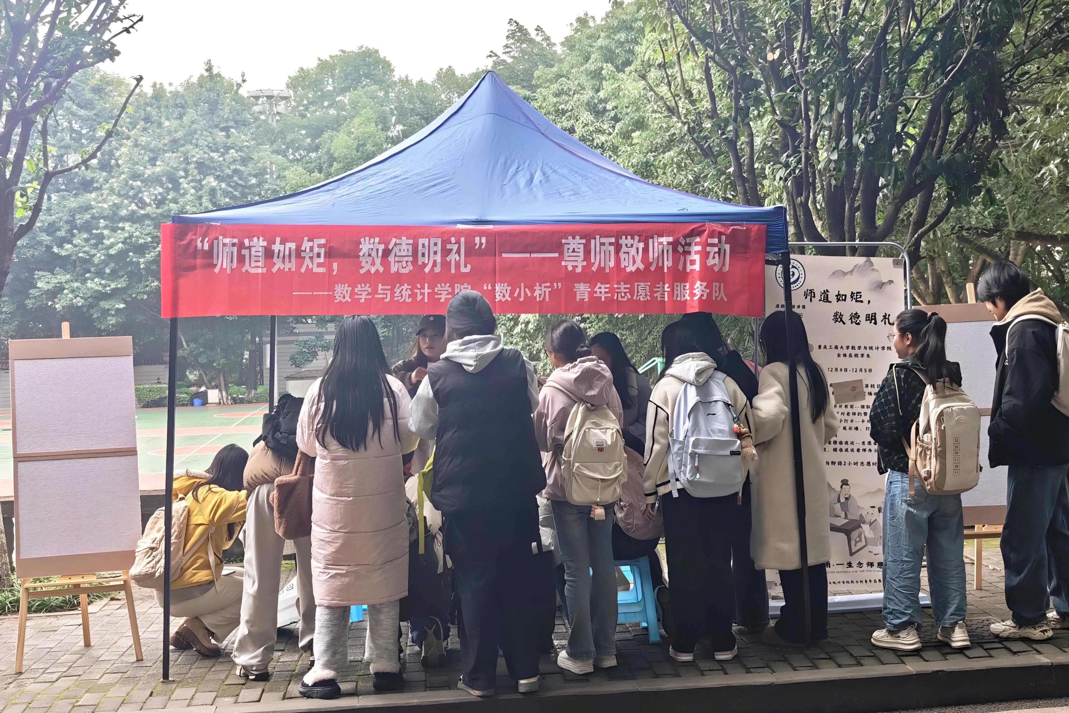 为弘扬尊师重教的优良传统,营造感念师恩、礼敬教师的浓厚校园文化氛围,12月4日,数学与统计学院“数小析”青年志愿者服务队在南岸校区南三宿舍前空场地顺利开展“师道如矩,数德明礼”尊师敬师活动。活动初期,志愿者们在南三宿舍前设立感恩卡片领取点,供同学们书写对老师的敬意与祝福,投入收集盒并登记信息。随后,志愿者在启智楼布置“师恩似海”展示墙,集中呈现部分感恩卡片,吸引众多师生驻足观看、拍照留念,满墙的手写祝福让校园洋溢着感恩氛围。活动后期,志愿者们将卡片分类整理,逐一送至教师办公室,...