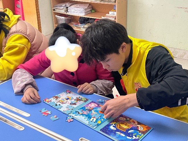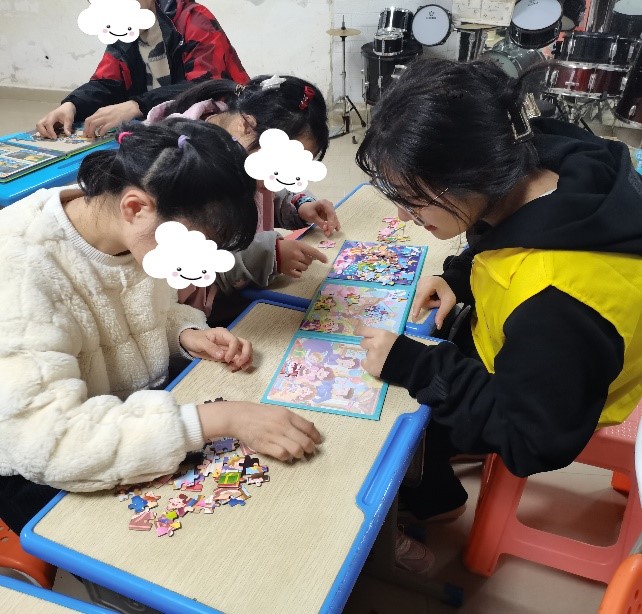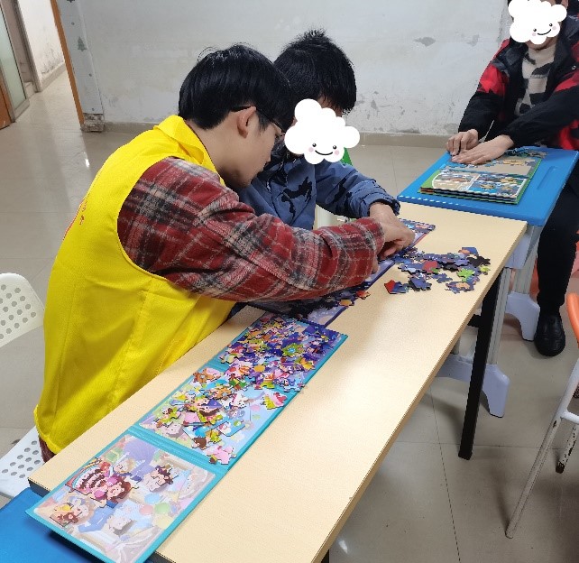 3月18日,重庆市“馨小青”助残青年志愿服务重庆工商大学分队的志愿者们去到了心和黄泥磅无专厂瑞吉花园内瑞吉天爱残疾人康复中心,同样与孩子们一起进行拼图,共同合作完成一幅幅拼图作品,陪伴智残儿童共同成长。