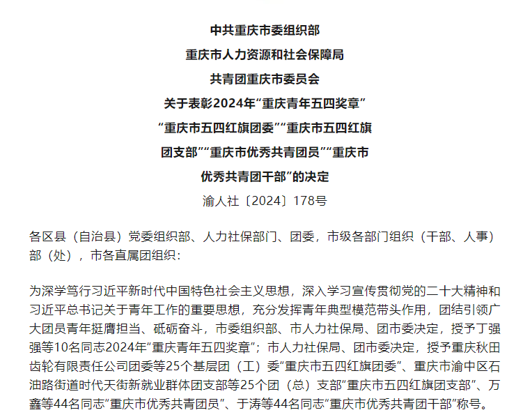 近日,中共重庆市委组织部、重庆市人力资源和社会保障局、共青团重庆市委员会联合发布了《关于表彰2024年“重庆青年五四奖章”“重庆市五四红旗团委”“重庆市五四红旗团支部”“重庆市优秀共青团员”“重庆市优秀共青团干部”的决定》,我校国际商学院团委书记冯诗淇荣获“重庆市优秀共青团干部”。