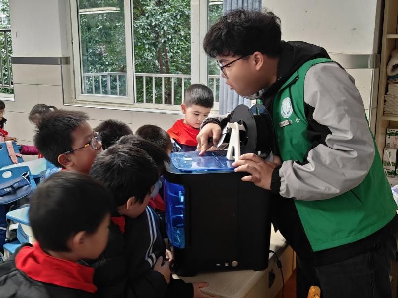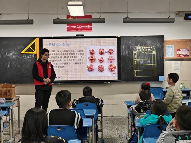 与此同时,科技协会成员面向二年级同学开展鲁班锁和 3D 打印技术原理的科普讲解。面对复杂的鲁班锁,成员们耐心地拆解演示,引导同学们动手尝试,让他们在实践中感受传统榫卯工艺的智慧与魅力。在 3D 打印技术讲解环节,讲解人员用通俗易懂的语言和直观的图片、视频资料,向同学们展示3D打印全过程,引导小学同学走进科学、了解科学。