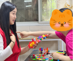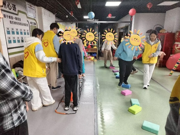 渝州心语基地,志愿者分两批行动——室内用彩色积木搭建闯关路径、训练绳设计趣味挑战,牵手引导孩子完成感统训练,欢声笑语充盈活动室;户外则牵手孩子逛公园,协助他们尝试骑行,用耐心守护每一份童真。在向日葵基地,举办“爱心相伴,温暖同行”活动,通过音乐律动、手工绘画、积木搭建等环节,倾听孩子讲述“高楼”“飞船”的创意,助力特殊儿童融入集体,让温暖与陪伴落地生根。