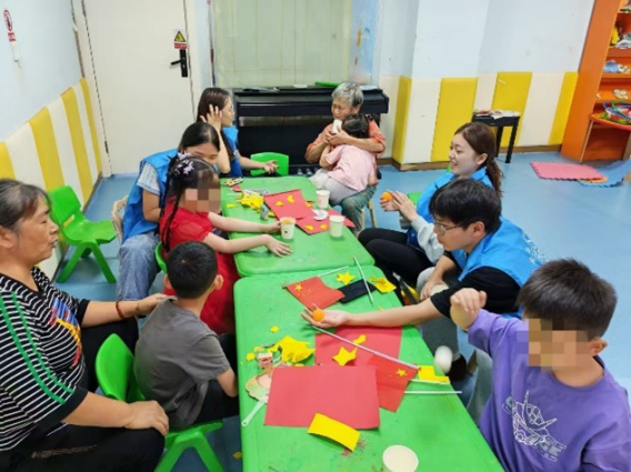 28日,同一时间段,管理科学与工程学院的志愿者,则走进重庆市南岸区小太阳特教中心,开展“国旗飘扬・爱满童心”迎国庆助残主题活动。活动以“爱国启蒙、残障关怀、能力培养”为核心,针对特教儿童设计8项沉浸式互动体验,通过国旗认知、红色手作、感官游戏等形式,将爱国主义教育与助残服务深度融合,为30余名残障儿童营造兼具节日氛围与成长价值的温暖场景。