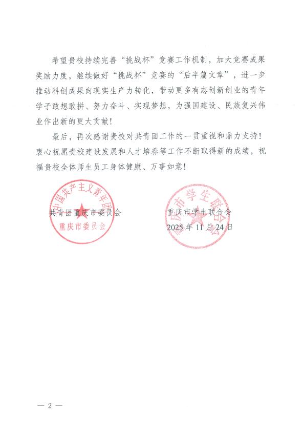 近日,共青团重庆市委员会向我校发来表扬信,对我校在第十九届“挑战杯”全国大学生课外学术科技作品竞赛中的组织工作和育人成效给予高度肯定。