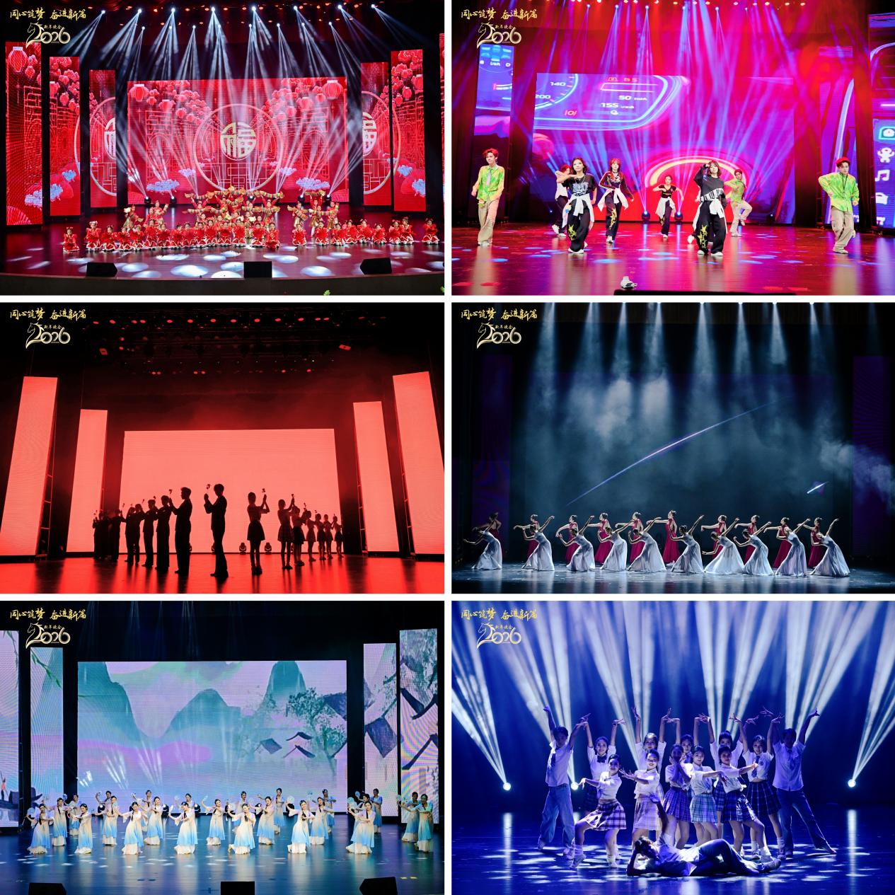 晚会以舞蹈、歌曲、小品等多元形式呈现,在幼儿舞蹈《欢欢喜喜过新年》的热烈节奏与童真笑颜中喜庆启幕。舞蹈《我们的歌》以翩跹灵动的身姿,将观众引入一幅春日漫行图,诗意的情境在舞台光影间徐徐铺展。教职工舞蹈团带来的《小城谣》古韵婉转,灵动身姿间流淌着江南水乡的温婉故事;街舞《疯狂动物城》以青春洋溢、活力十足的舞姿,彰显出青春蓬勃的生命力。歌曲串烧《我想听你唱》以耳熟能详的旋律串联澎湃情感,引发全场共鸣,声声合唱如暖流涌动。舞蹈《小池》以清丽脱俗的意象,勾勒出泉眼无声、细流潺潺的春日静谧画卷;《西子湖·初妆》则晕染出江南烟雨中的朦胧秀色,舞姿如水墨点缀,含蓄动人;《洞庭秋月》则以舒展优美的肢体语言,演绎湖光潋滟、秋月皎洁的浩渺意境。拉丁舞《我们正青春》热情似火、节奏明快,舞步中尽显朝气蓬勃的生命风采;舞蹈《玉鸟》则通过柔美翩然的动作,仿若灵鸟振羽,展现了充满活力的自然之美。小品《十年之约》以温情与幽默交织的叙事,讲述岁月流转中不变的情谊与承诺,笑泪之间触动人心。晚会中,与会领导嘉宾、师生及校友代表送上新年祝福,并为现场观众抽取幸运奖品;校团委抖音直播间也同步以发福袋的方式为2万余名线上观众送上祝福,晚会气氛热烈高涨。最终,晚会在全场齐唱校歌《大路漫漫其修远长》中圆满落幕,歌声凝聚着全体重工商大人团结奋进的决心,汇聚成不断前行的磅礴力量。