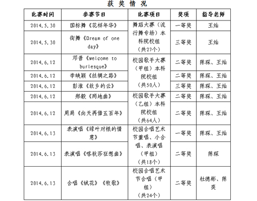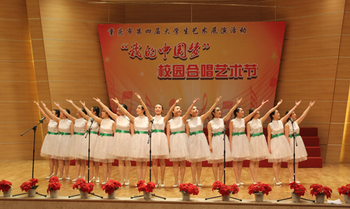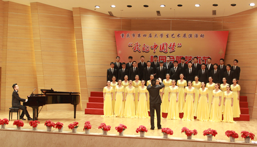 6月13日,由重庆市教育委员会主办,重庆师范大学、重庆市学校艺术教育协会声乐艺术专委会承办的重庆市第四届大学生艺术展演活动--“我的中国梦”校园合唱节在重庆师范大学音乐厅举行。比赛分为甲(普通组)、乙(专业组)两组,包括合唱、表演唱、重唱、小合唱。我校艺术团合唱分团的表演唱《绿叶对根的情意》获甲组一等奖,合唱《绒花》《牧歌》获二等奖;2014校园十佳歌手组合的表演唱《喀秋莎狂想曲》获甲组二等奖。