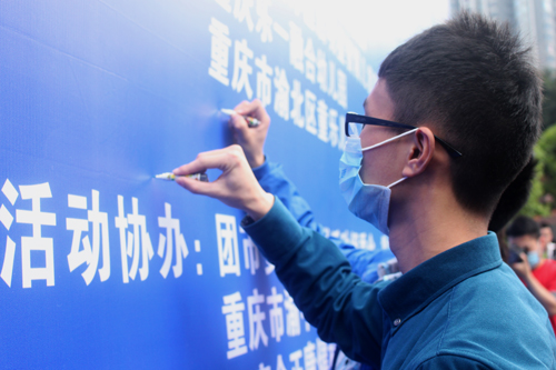 下午14点30分,重庆南坪宏声文化广场,200余名手举彩旗、身着蓝衣、戴着蓝口罩的志愿者聚集于此,准备开始一次特殊的 “蓝色行动·今天不说话” 徒步倡议:从宏声文化广场出发,途径永辉超市、万达广场,再回到宏声文化广场,用“今天不说话”的方式体验自闭症儿童“无声的世界”。