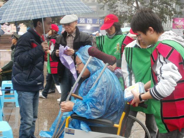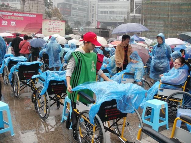 捐赠现场,我校50名义工志愿者身着统一的义工服装,将1500辆爱心轮椅整齐的布置在观音桥广场上,同时,义工们还用自己行动和爱心温暖着现场的每一个残疾人,他们分别承担了后勤保障、场地保障、观众引导、获赠代表入场等岗位的工作。
