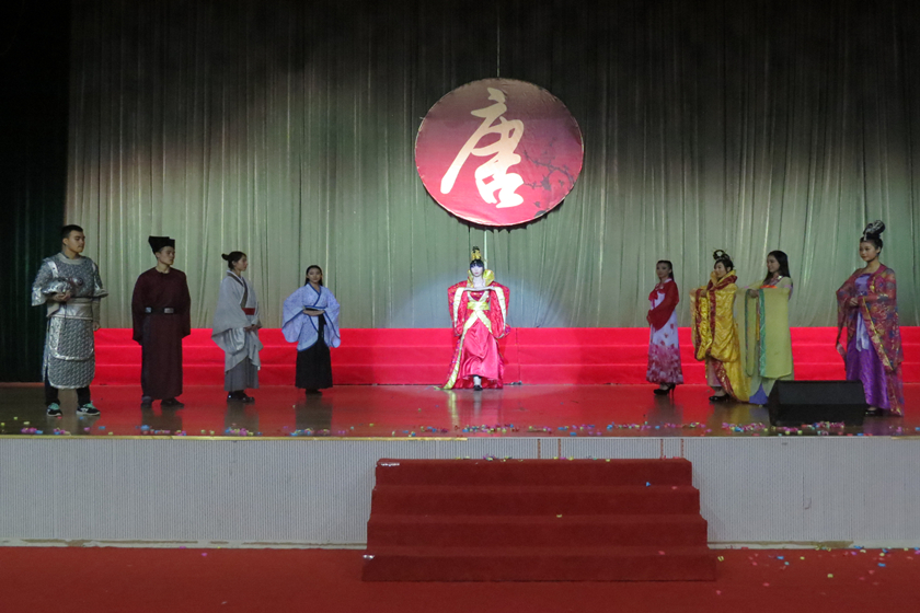 一幕皇帝上朝的舞台剧拉开活动的帷幕,引领观众走进唐朝,开启游园会。 “帝王故事”、“穿越盛唐”、“翰墨飘香”、“唐诗风韵”、“梦回大唐”、“历史剪影”六大展区各显风采;唐诗背诵、书法比赛、人物解析、服饰租赁等活动形式更让同学们充分融入唐朝文化,感受唐朝魅力。中场表演的T台秀赢得同学们热烈掌声,唐朝服饰映入眼帘,诗歌朗诵、古曲演唱让人回味无穷。