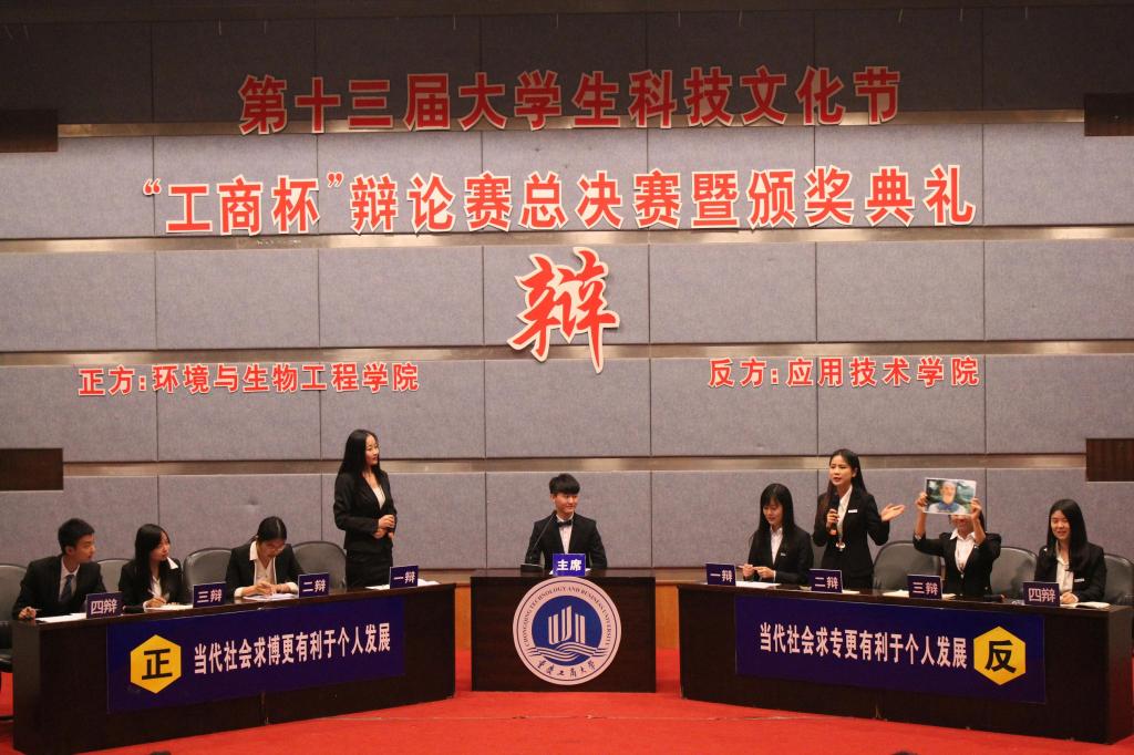 4月10日15:00,由校团委主办的我校第十三届大学生科技文化节之“工商杯”辩论赛总决赛在博智楼7100报告厅举行。本届“工商杯”辩论赛历时半载,经过40余场比赛的激烈角逐,共有17名学生评委、13名老师评委参与评选,从19支学院代表队中脱颖而出的环境与生物工程学院代表队、应用技术学院代表队迎来了最后的巅峰对决。校团委杨娟副书记,部分学院党总支书记、副书记,来自全校各学院的500余名师生观看了比赛。