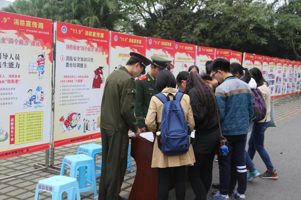 11月9号上午,校保卫处、南岸区消防支队二塘中队消防员与计信学院学生会的同学一起在学校7教门口摆放学校教室、宿舍、计算机室、实验室等场所的消防知识宣传板报、并且在现场设置咨询答疑台,发放火灾事故预防、火灾事故逃生急救知识等宣传单,为工商师生宣讲消防知识。老师和同学们都主动上前观看展板内容,拿取消防宣传资料来提升自我消防安全意识。