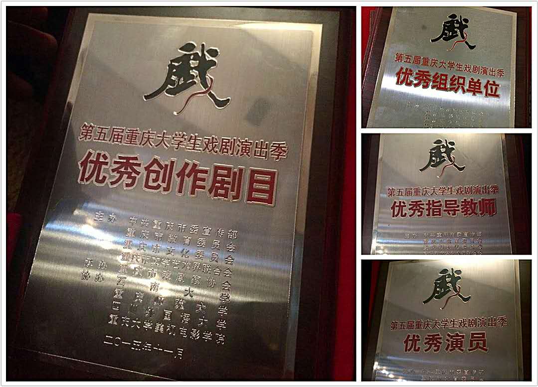 据悉,重庆大学生戏剧演出季由市委宣传部、市教委、市文化委、市文联主办,自2005年创立以来,已走过10个年头,目前己经发展成为每两年举办一次,社会影响力最大的群众业余戏剧专项活动。本届戏剧季共有44个剧目申报参加,经过专家对剧本的选拔和第一轮筛选,共选出包括重庆工商大学话剧《同心》、重庆大学话剧《热忱》、重庆师范大学话剧《局外人》、四川外国语大学话剧《原野》等21部剧目进入到第二轮交流演出。11月24日,我校原创话剧《同心》在重庆师范大学演出,获得专家评委和现场观众的一致好评,并荣获“优秀组织单位”、“优秀指导教师”、“优秀演出剧目”和“优秀演员”等四大奖项。