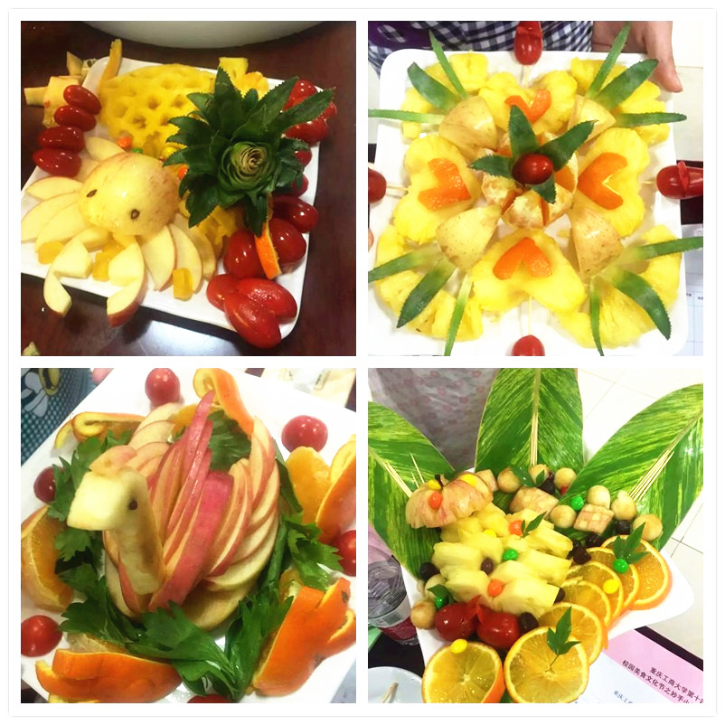 来自全校各学院的20支参赛代表队随机分为三组先后进行厨艺大比拼,每组的厨艺展示分为水果拼盘与炒菜两部分。各学院代表队参赛选手戴上口罩系上围裙,“全幅武装”地出现在厨房,选手们熟练地切菜、炒菜、装盘,一切井然有序。一时间,厨房里传出锅碗瓢盆相互碰撞的声音,飘出的诱人香气挑动着味蕾,更有食堂里的大厨师傅在一旁细心指导。比赛时间到达后,各学院的代表队展示出自己的菜品,炒菜有书香肉丝、回锅肉……而水果拼盘更是让人眼前一亮,有“奇幻森林”、“雨后彩虹”等等,在讲解自己菜肴的内涵与意义后,依次请评委老师进行品尝并打分。各学院的“大厨们”用他们精湛的厨艺、新颖的摆盘为评委和观众带来里一场真正的饕餮盛宴。