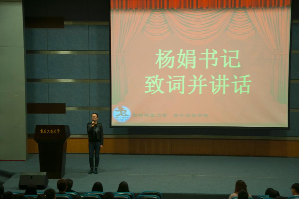 大会伊始,校团委杨娟副书记为大会致辞。她介绍了我校学生会的组织结构,指出学生干部首先是学生,其次才是干部,要学会做到二者的平衡。随后,杨书记为新一届学生会干事提出了四点建议:正确认识当前工作;正确认识学生干部的身份;正确认识学生工作的价值体现;学生干部一定要有政治意识。杨书记的讲话言简意赅却又意味深长,饱含了对新一届干事的殷切希望。之后,全体起立奏唱校歌《大路漫漫 其修远长》,庄严肃穆,熟悉的旋律演绎着时代的激越,也唱出了全体学生会成员心中的众志成城。
