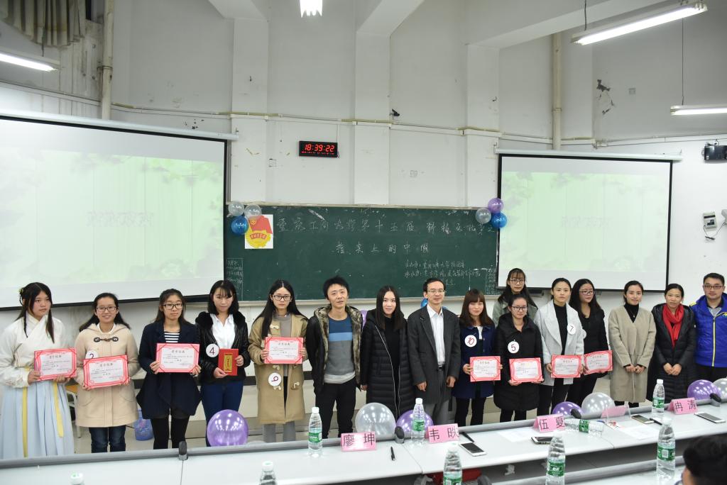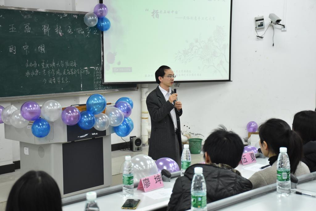 2016年12月7日晚5:30,由重庆工商大学校团委主办,艺术学院建筑装饰艺术分院分团委学生会承办的第十五届科技文化节之“指尖上的中国”民俗创意手工艺大赛于南岸校区兰花湖片区广智楼20211教室举行。艺术学院建筑装饰艺术分院党总支副书记冉涛书记,分团委老师刘莎老师,辅导员周雪玉老师、魏楠杭老师,专业指导老师韦昳、伍夏、廖坤等应邀出席承担本次活动的评审工作。