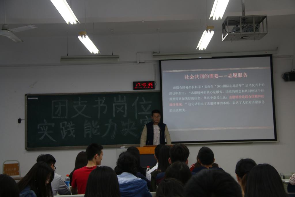为扎实开展“学习总书记讲话,做合格共青团员”教育实践,切实加强团支部书记队伍建设,重在提升团支部书记的思想政治素质、服务团员意识和业务工作能力,进一步彰显团支部书记的模范带头作用,为团支部书记搭建展示自我、提升能力和交流工作的平台。4月,校团委启动了“团支部书记岗位实践能力”比赛。经过各学院推荐、初赛选拔,最后共有10名支书进入了决赛。5月11日,决赛在慧智楼90207教室举行。校团委陈琛老师、校团委学生副书记张笑冉、校学生会主席肖程钱、副主席曹鑫担任评委。