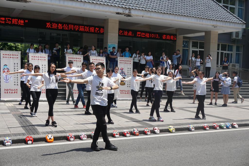 同学们表演的是中国有史以来第一套“戏曲广播体操”,戏曲操创新性的把戏曲程式化动作融入到大众健身理念,以流行动感的音乐配合优美的戏曲基本功动作,2017年1月一经推出便刷爆朋友圈,但是戏曲操目前在高校的推广的速度还有待加快。