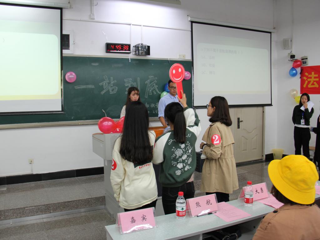 为深入学习贯彻十九大精神,弘扬法学院的学院文化,也为了开拓同学们视野,丰富同学们的课余生活,重庆工商大学法学院特举办“一站到底”法律知识竞赛活动,以趣味比赛的形式为同学们提供展现自我的机会,提高同学们的综合素质。本次活动于2017年11月10日下午四点在我校南岸校区慧智楼90309教室举行。部长韦苗朦与干事陈江涛担任此次活动主持人。