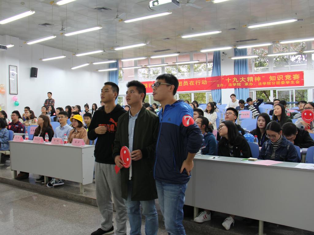 出席本次活动的嘉宾有14级法学院分团委学生会主席许大勇、法学院分团委学生会副书记成涛、学生会主席黎娜及副主席熊航、邓馨纯、胡瑞。本次知识竞赛分为初赛与决赛,比赛的题目主要涉及十九大主题内容和的法律知识。此次活动共有八支队伍参赛,每支参赛队由三人组成。初赛分为120秒作答与抢答环节两个环节,初赛中,八只队伍全神贯注答题,每队的各位选手也聚精会神,奋力思考,充分地发挥了自己的聪明才智与学术知识,各队员之间团结一致,配合默契。在抢答环节,各队伍迅速审题,动作敏捷举起作答牌,回答问题,不甘示弱,初赛结果有六支队伍晋级到最后的决赛。决赛分为三个环节,比赛的竞争在决赛中越发激烈,各队都实力不相上下,在一番比拼之后,比赛结果在众人瞩目之中揭晓:五组荣获冠军,一组夺得亚军,七组获得季军。最后许大勇学长就本次活动的组织开展情况进行了详细的点评,并表达了对法学院学生会的无限期望。