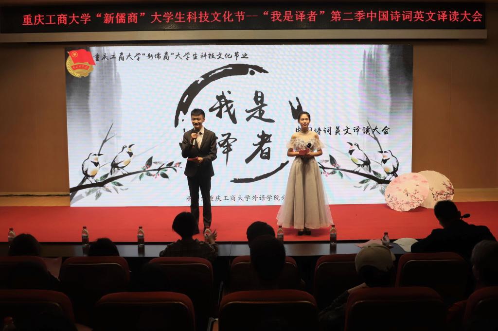 2018年4月20日,由共青团重庆工商大学委员会主办、外语学院分团委承办的重庆工商大学“新儒商"大学生科技文化节之“我是译者”第二季中国诗词英文译读大会在田家炳209报告厅成功举办。重庆工商大学学工部部长、学生处石世明处长、外语学院党总支陈晓东书记、外语学院副院长周琳、外语学院党总支副书记陆嘉出席了本次活动,外语学院刘勇老师也作为点评嘉宾参加了活动。