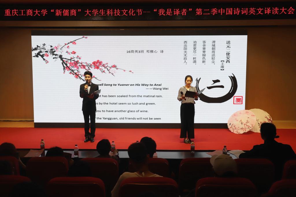 “我是译者”中国诗词英文译读大会以“赏中华诗词、承传统文化、学英文精髓”为基本宗旨,力求通过对诗词翻译的比拼及赏析,带动全校青年学生重温中华古诗词,运用英语翻译技巧,分享诗词之美,感受诗词之趣,从古人的智慧和情怀中汲取营养,涵养心灵,自举办以来,吸引了众多热爱中国诗词文化的学生参加,华龙网也以《重庆工商大学“我是译者”弘扬传统文化 英译“中国诗词”》为题全程报道了活动。