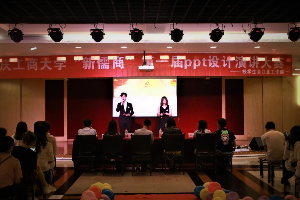 5月25日18:30,由校团委主办、校学生会承办的“新儒商”第一届PPT设计演讲大赛决赛在我校江北校区学生活动中心举行。通识学院(江北)团委副书记杨阳老师,校学生会副主席、重庆市会展策划技能大赛最佳PPT制作奖得主陈静怡,通识学院(江北)学生会主席王彦琦和2017年中国宁波商业精英挑战赛一等奖得主池柃萱同学担任比赛评委。
