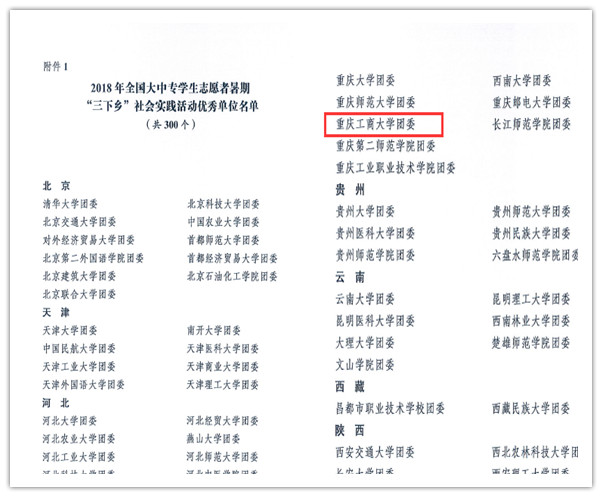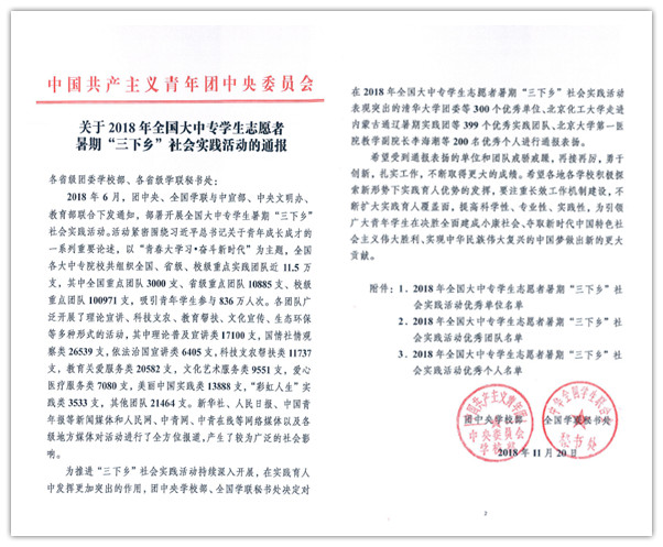 11月20日,团中央学校部、全国学联秘书处下发了《关于2018年全国大中专学生志愿者暑期“三下乡”社会实践活动通报》,校团委获评全国优秀单位(全国共评选300个)。11月16日,全国大学生志愿服务西部计划项目管理办公室下发了《关于对在2018年西部计划招募宣传工作中表现突出的项目办进行通报表扬的通知》,对包括我校在内的185个高校项目办提出通报表扬。