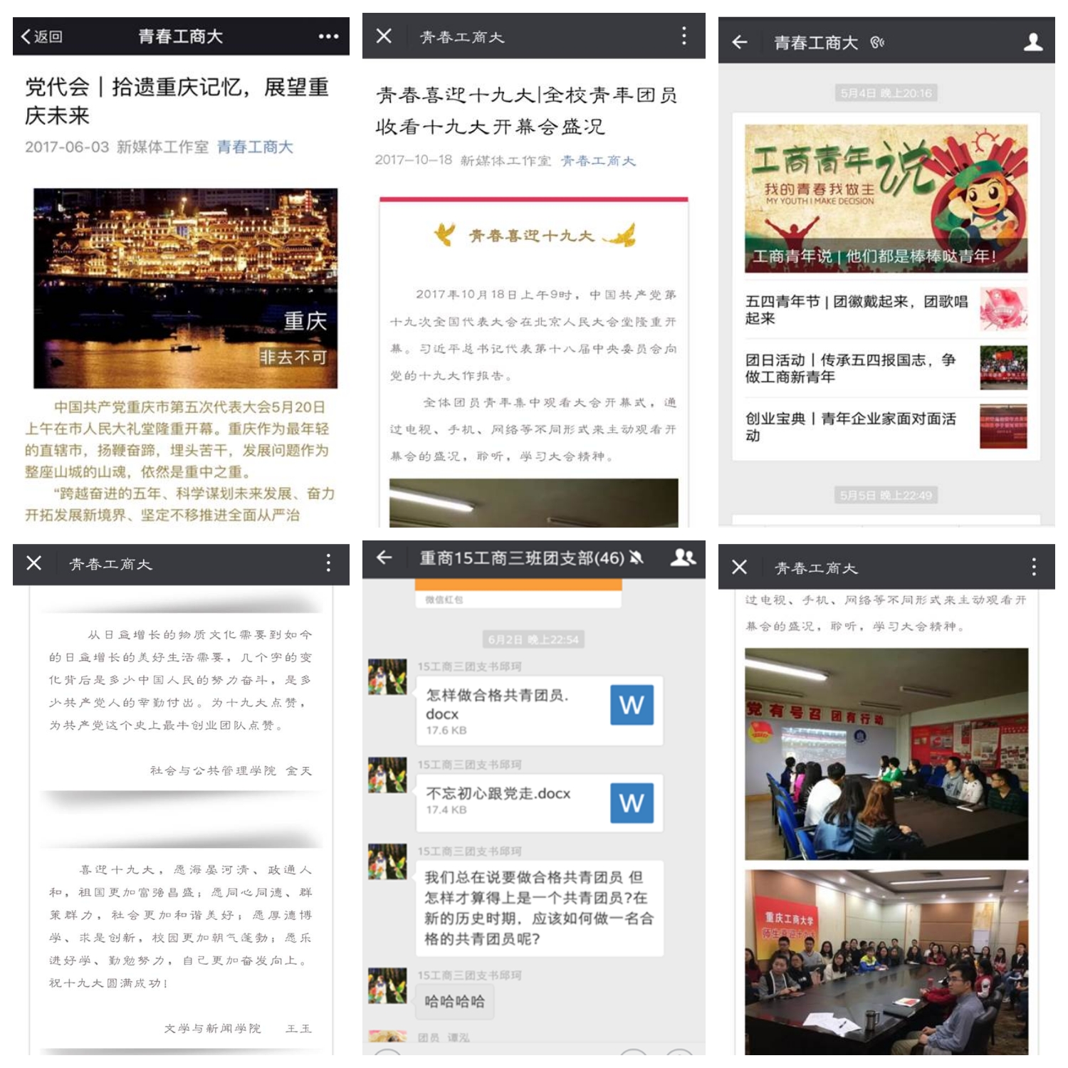 迈步全面从严治团的主干道,团的自身建设水平得到新提升。党建带团建,团的工作更有底气。学校党委高度重视团的建设,每年专题研究共青团工作,先后印发《共青团重庆工商大学委员会改革实施方案》《重庆工商大学学生社团管理办法》等文件,将团的建设纳入二级党组织目标考核;依靠习近平新时代中国特色社会主义思想研究院的师资力量,在全市率先成立习近平新时代中国特色社会主义思想学生研习团,指导社团开展活动10余次。共青团改革措施逐步落实。出台我校共青团改革方案,共5大方面16项改革举措,现已完成75%;通过“青年点单”,精简校级团学活动20%,运用新媒体手段指导和推动精简办事流程、会议、文件、简报25%以上;构建“一心双环”的组织格局,学生社团联合会主席由校学生会副主席兼任;开展班团一体化建设,从2017级起全面实施班长兼任团支部副书记或团支部书记兼任班长的制度;校领导主持市深改办课题研究共青团改革工作。团的自身建设不断优化。加强团的基层组织建设,制定团员入党推优制度,向党组织推荐入党积极分子占团员数12%;近600个团支部参与“活力提升”工程,2个团支部获评全国高校活力团支部;全覆盖开展团支书满意度测评,全市团支书“背靠背”满意度测评示范活动在我校举行;社团建团77个,网络建团700余个,构建起纵横交织的基层组织网络;通过构建新媒体矩阵、组建网络文明志愿者队伍、开发APP移动应用等方式,加快“网上共青团”建设,主动发声,敢于亮剑,以生动活泼、喜闻乐见的表现形式,真正把思政工作做到网络上,做到广大青年学生的心坎里。严肃团内组织生活,规范基础团务。青马工程培训团员近3万人,团干作风明显转变,意识和能力得到提升。近年来,4个团支部获全国表彰,校团委获评重庆市“五四红旗团委”、近4年连续获评重庆市共青团工作先进集体。