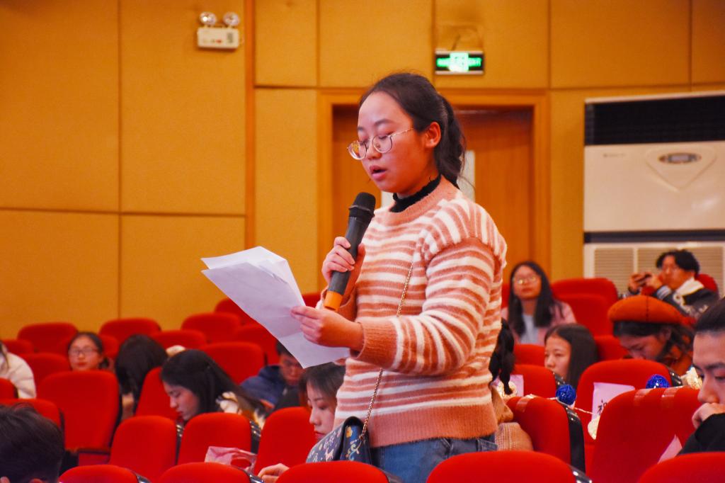 选手表演完毕后,评委李佳玲同学对此次比赛进行点评。首先,她对大家的精彩表演以及服装道具的充分准备表示惊喜,对全体参赛人员辛苦付出的感谢。同时,也提出了一些舞台设计、情节设计的方面的建设性意见,给选手们带来诸多启发。