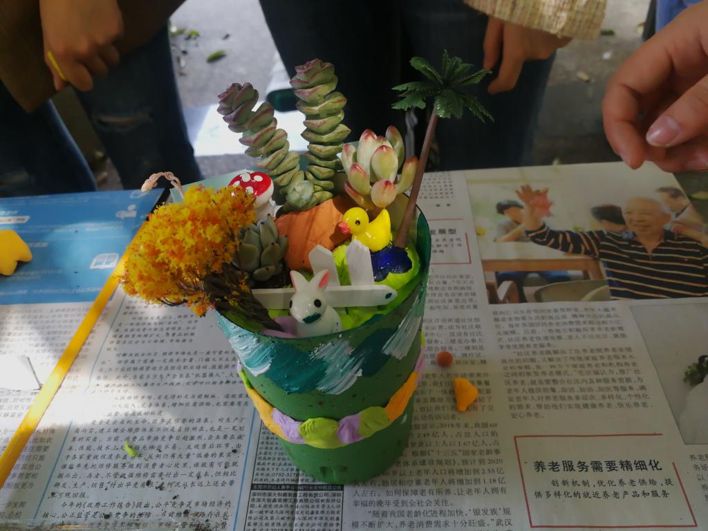 活动开始,主持人介绍了本次比赛举办的背景、比赛规则、要求以及评分细则。二十支参赛队伍带着废弃的纸盒、碗、杯子、瓶子等材料,有序签到入场,领取手工制作素材。比赛共两个环节,分两轮进行。第一环节为团队DIY创作多肉盆景环节,比赛现场,各个小队在规定的时间内进行制作,他们分工明确,或是在盆景上涂鸦、或是进行多肉栽种,或是布置盆景,不一会儿一个个精致的、寓意深刻的多肉盆景制作完成。第二环节为展示环节。参赛队伍依次向大家阐述作品制作理念,选手们的作品大多体现出了自然之美,生态之美,人与自然和谐之美,评委们认真了解,现场打分,在场观众也在线上投票选出自己最喜爱的作品。