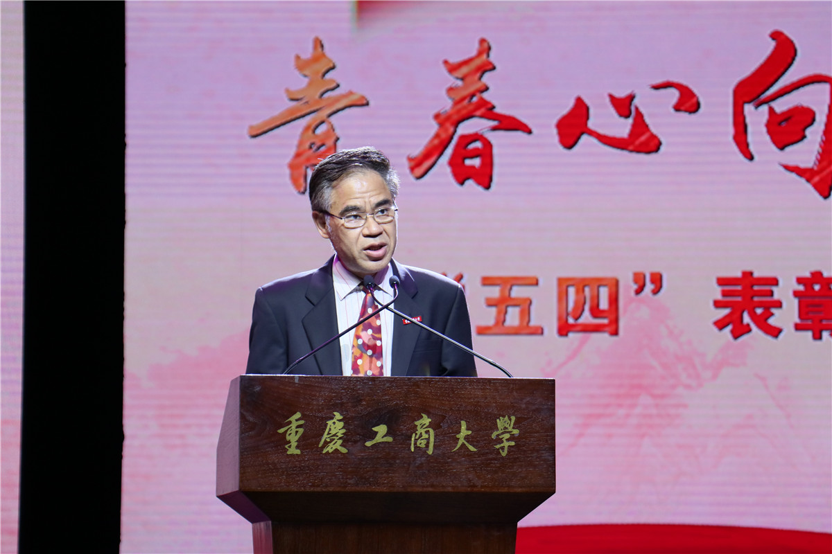 “光荣啊,中国共青团!”活动在嘹亮的团歌中拉开序幕。校党委李志雄书记为活动致辞。他首先代表学校向工商大曾经的青年,现在的青年和青年的未来,致以节日的祝福和问候,向今天获得表彰的集体和个人表示热烈的祝贺。李书记谈到,1919年5月4日爆发的五四运动彰显的“爱国、进步、民主、科学”的精神,如一道闪电照亮了历史的天空,穿越了整整一个世纪的沧桑,至今仍然在人们心中激起巨大回响。历经一代代人传承、发扬与积淀,五四精神成为百年来中国青年与国家前途命运同频共振的鲜明标识,在“改造、改变中国”的伟大实践中,中国青年以奋勇之姿创造了举世瞩目的伟大奇迹,用青春的力量铸就了青春的中国。在学校67年办学历程中培养出的13万多青年学子,他们也正是传承了五四精神,以青春之我,青春之国家,青春之民族的豪迈气概,走向社会,投身国家建设和民族复兴的伟大事业中,贡献出我们CTBU的智慧和青春力量。今天,我们的青年理想信念更加坚定,青年育人体系更加健全,青年育人品牌更加丰富,青年育人效果更加突出。值此纪念五四运动100周年之际,他对全校的青年提出了三点希望:一是传承五四精神,做爱国的新时代青年。希望工商大青年弘扬爱国精神,把爱国之情、报国之志融入祖国改革发展的伟大事业之中、融入人民创造历史的伟大奋斗之中。二是弘扬五四精神,做奋斗的新时代青年。希望工商大青年敢于有梦、勇于追梦、勤于圆梦,把爱国情、强国志、报国行自觉融入坚持和发展中国特色社会主义事业、建设社会主义现代化强国、实现中华民族伟大复兴的奋斗之中,“含弘自强,经邦济民”,在知行合一中主动奋斗、担当、作为,不负韶华,不辱使命。三是崇尚科学真理,做创新的新时代青年。希望工商大青年走在创新创造前列,“厚德博学,求是创新”,让创新成为青春远航的动力,让以创新而增长的本领成为青春搏击的能量,用创新精神谱写无愧于时代的新篇章。