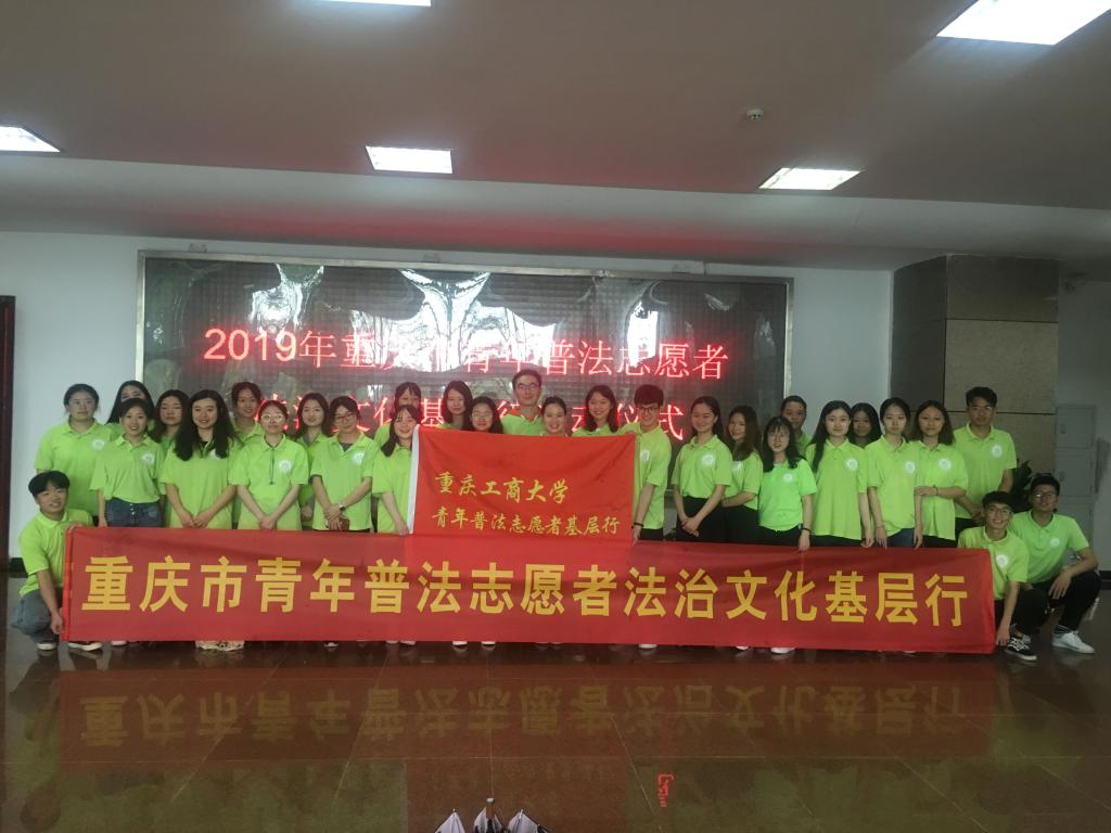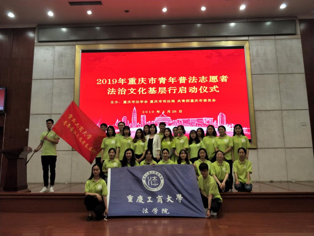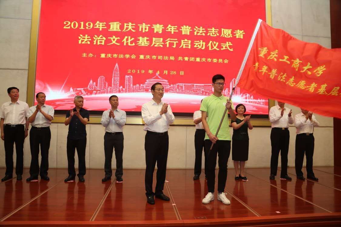 为贯彻习近平总书记全面依法治国新理念新思想新战略,4月28日上午,由重庆市法学会、市司法局、团市委共同主办的2019年青年普法志愿者法治文化基层行活动启动仪式在西南政法大学举行,重庆市委常委、市政法委书记刘强、市司法局局长张德宽、团市委书记张继军等领导出席大会。重庆工商大学法学院组建的青年普法志愿者服务队参加了本次活动的启动仪式。