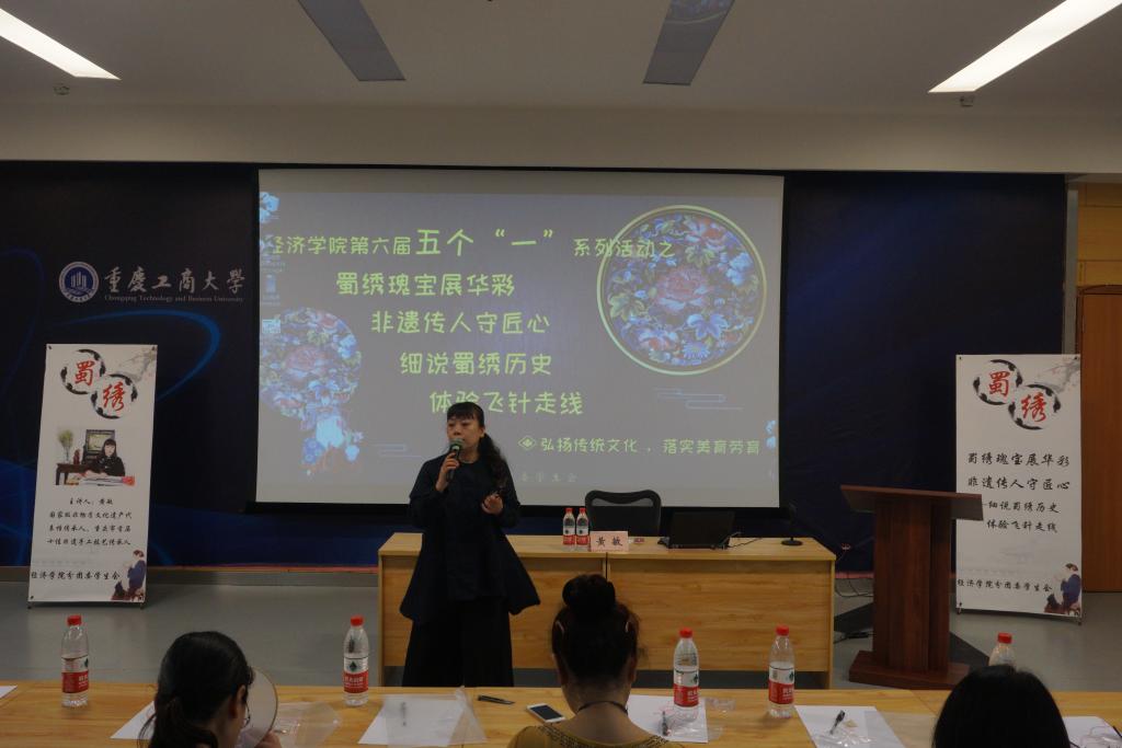 “我生活在一个传统文化氛围浓厚的家庭,青年时代受到蜀绣工艺大师们的栽培,希望用一针一线传承蜀绣工艺并发扬光大,更希望在座的同学能喜爱这门技艺,大力宣传我们的蜀绣!”在雷动的掌声中,国家级非物质文化遗产代表性传承人、重庆市工艺美术大师黄敏将蜀绣带进重庆工商大学的课堂。