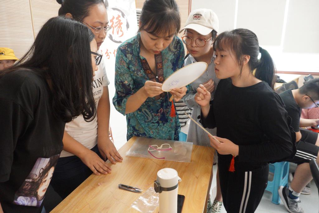 现场体验阶段,从如何穿针、引线、打结开始,黄老师和助教们手把手教同学们双面刺绣,有的同学绣荷花、有的同学绣玉兰、有的同学绣小猫,同学们开始有些下不了手,到后来都绣得津津有味,但是哪怕是一朵简单小花,也要绣一个小时才能完成,同学们体会到传统手工艺的不易,同时也发现了劳动的乐趣。