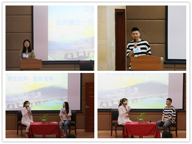 活动伊始,赵娅婷以如何输出一份高质量简历为引,讲述了自己在制作简历时会扬长避短,突出优势、简明信息的小技巧,同时鼓励大一的同学们现在就要简单制作一份简历,用四年的时间去不断完善、充实,最后收获最适合自己、最全面的成果;随后又为大家分享了她的学习经验,向大家证明成功绝非一日之行。张金豪同学对时间规划与定向做出了讲述,他表示,考研其实与找工作在一定程度上是可以兼顾的,但是需要保证学习的时候就一定要全身心投入,充分休息和放松时间以提高效率,他说:“学习在任何时候都是稳赚不赔的,被录取很舒服,没有的话也一定会有所收获。梦想不一定能实现,但只要一直努力,就会离它越来越近!”。鞠艺同学则从想要考公务员讲起,分享了她的备考事迹,她认为:“勤奋是必须的,但理性选择也很重要,有的时候选择甚至是大于努力。达到一个个目标当然需要付出,比如在别人追剧、出去和朋友玩的时候,自己就要耐得住寂寞,完成眼下该完成的事情。”最后,现场观众和三位优秀的学长学姐进行了面对面交流和解惑。