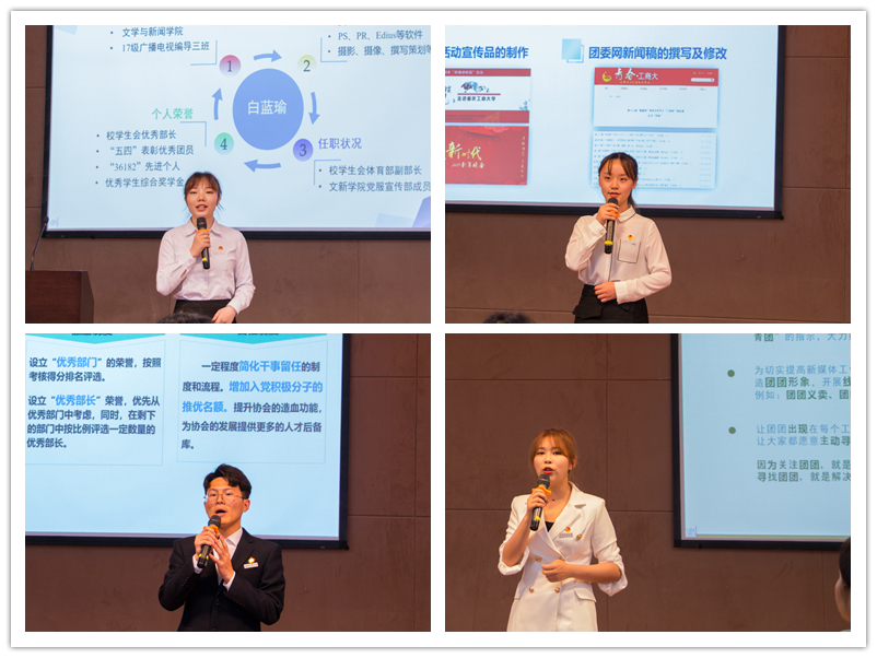 竞职演讲由候选人按照抽签顺序依次进行3分钟的演讲和3分钟抽题答问环节。演讲开始前,大家跟随精心制作的视频一起回忆了校团委一年工作来工作的点点滴滴。随后,杨娟、陆嘉副书记,王微老师为主席团颁发纪念品并表达了感谢,肯定大家一年来为团委做出的卓越贡献。在演讲环节中,演讲者们精神饱满,热情洋溢,从自我介绍、工作理念,工作思路、工作计划等方面进行了精彩的演讲。答题环节,候选人根据现场抽到的题目,围绕学生会建设、“互联网+共青团”等工作进行了答题。