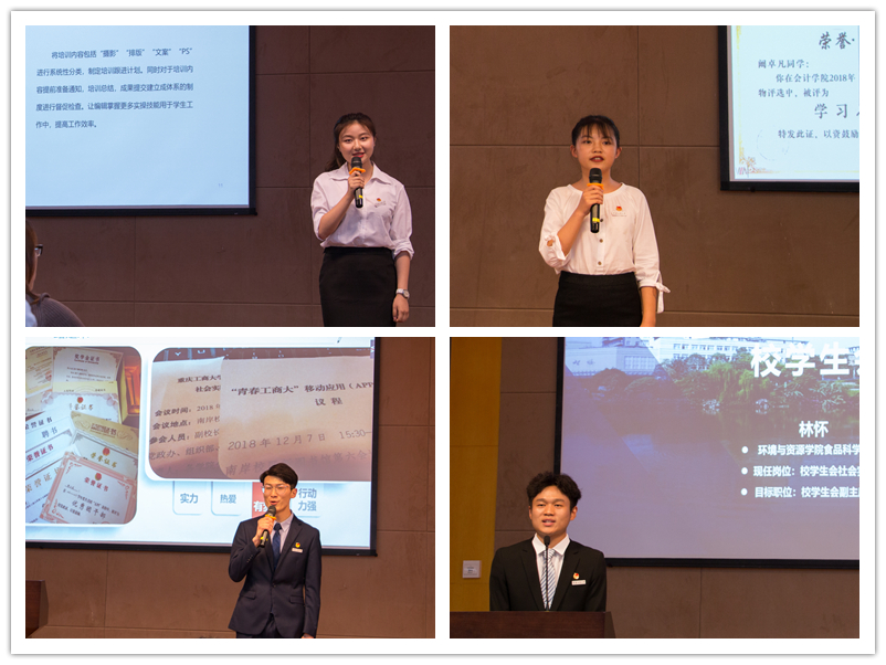 6月10日18:00,我校团委(学生)副书记、第十八届学生会主席团换届竞职演讲在南岸校区图书馆第六会议室举行。校团委杨娟、陆嘉副书记,团委老师,各学院分团委书记、学代表,校团委五个学生组织主席团作为评审和现场百余名同学共同聆听了候选人们的精彩演讲。