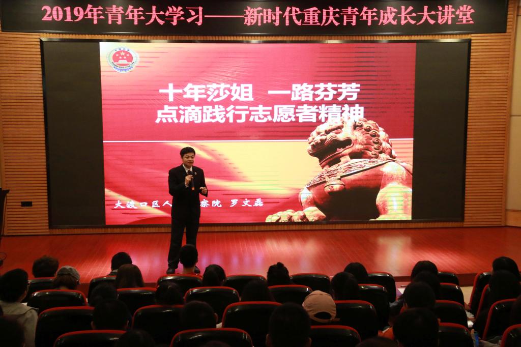 10月17日下午2点,由团市委主办,重庆市团校、重庆工商大学校团委承办的2019年“青年大学习——新时代重庆青年成长大讲堂”暨“重庆共青团青年讲师团”走进重庆工商大学分享会在南岸校区博智楼7200顺利举行。重庆市大渡口区人民检察院公益诉讼办公室罗文磊主任,重庆红曼农业开发有限公司魏先曼总经理,市团校教务人事部张吟副部长,雍峻,杨珏贤,校团委陆嘉书记、陈琛老师以及300余名学生一同参与了本次分享会。