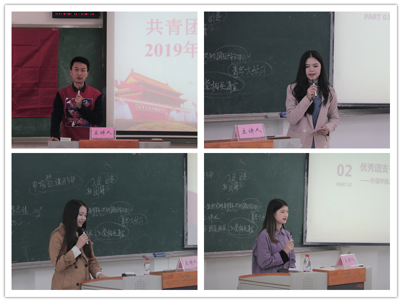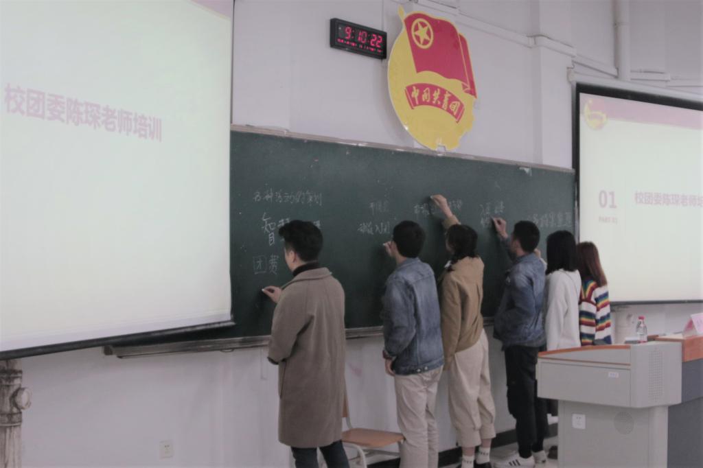 会议伊始,陈琛老师发表讲话,他简明扼要地阐述本次培训的目的和意义,并围绕智慧团建、“三会、两制、一课”、团员大会,团小组会,团员注册,团员民主测评,团课,微团课等方面进行讲解。他总结到:“团支部书记是最忙碌的一个职位,也是最体现能力的职位”。随后,向华同学分享自己成为团支书以来的心得体会,她就处理好与班长、同学间的关系,规范自己的言行举止,背靠背测评,参加“十佳团日活动”等方面进行总结,并强调团支书要以集体为重,有大局意识,主动为班级争取荣誉,同时她表示,希望在场的团支书们能在今后的工作中能积极向上,找到团支书存在的意义。此外,段霞同学以“改革开放四十年,不忘初心跟党走”为主题,提出有关团日活动的一些经验,并展示以往班级的优秀团日成果。她指出,通过每一次活动的成功开展,她明白了脱颖而出的团日活动需要新颖的开展方式、严谨的策划方案以及班委的积极领导和班级成员的配合。团日活动的成功来源于一个组织的配合,也归功于领导者的努力。培训会最后,陈琛老师以问答的方式详细地解决同学们的疑惑。