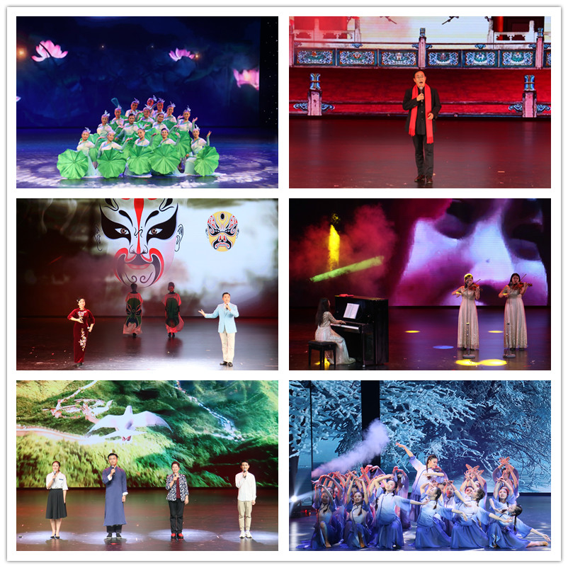 演出正式开始,杜德彬老师带领大学生艺术团合唱分团的同学轮番上阵,《梨花又开放》婉约动人,《同桌的你》勾起观众们来自青春年华回忆的心绪;通识学院的同学带来的舞蹈表演《剪纸姑娘》让中国红洒满整个会场;情景朗诵《永远的格桑梅朵》扣人心弦,大学生艺术团语言艺术分团的同学深情而投入的表演,将一幅雪域坚守图栩栩如生地呈现在观众面前;歌曲串烧《经典咏流传》将现代流行与古典相结合,别出心裁的表演方式将晚会带入一个又一个的高潮;退休教职工的舞蹈《荷叶蹁跹》与教师们的戏曲联唱《梨园荟萃》,让同学们更看到一个才高八斗,能唱会跳的“别样”的老师;留学生代表们青春洋溢的现代舞蹈让年轻的学子观众们为之振奋;由管乐分团带来的小提琴钢琴合奏《我和我的祖国》和语言分团带来的朗诵《永远的初心》带领观众们回首那段属于先辈们的燃情岁月,激发了工商学子努力奋进,报效祖国的崇高理想;北国风光,千里冰封,万里雪飘,由舞蹈分团带来的压轴节目——舞蹈《沁园春雪》用优雅而动人的舞姿,为晚会划上圆满的句点。