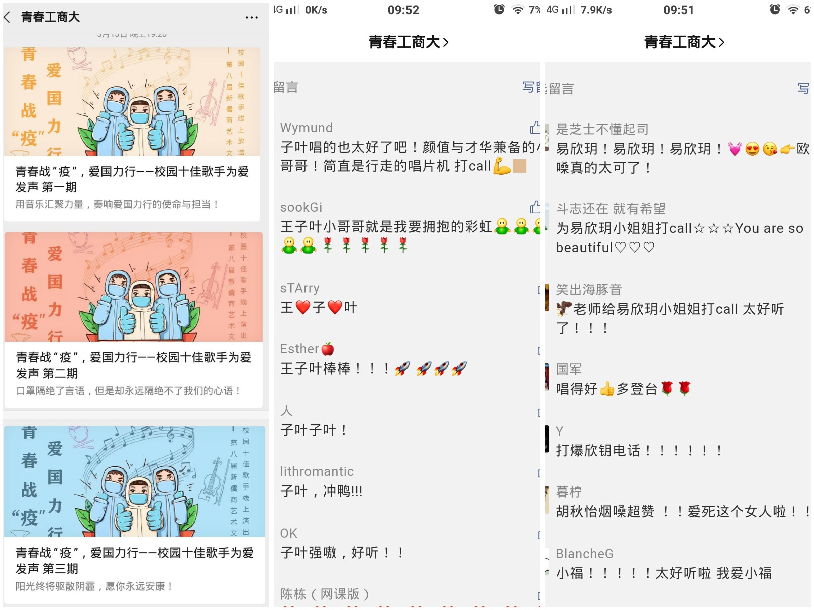 本次十佳歌手线上活动获得我校同学们的广泛好评,同学们在微信留言处积极互动,让本次“为爱发声”线上活动的主题更加的明确。