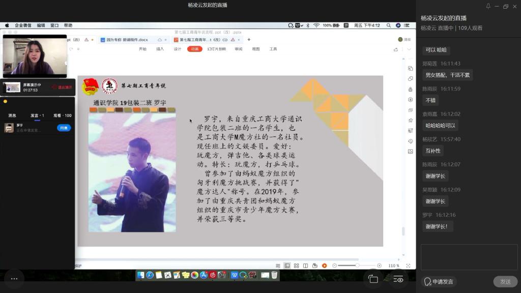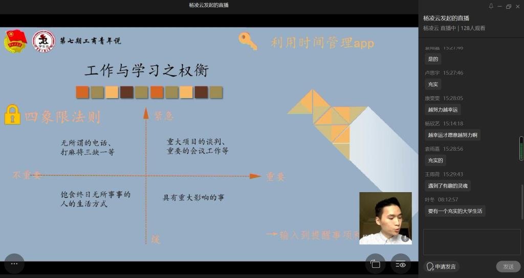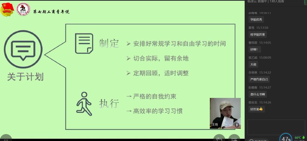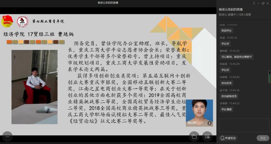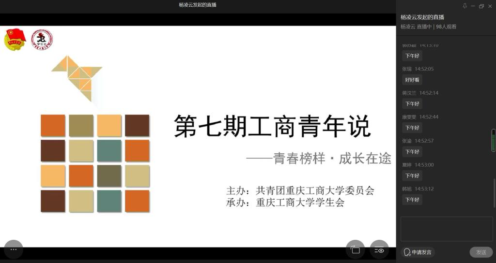 4月3日15:00,由校团委主办,校学生会承办的第七期工商青年说在企业微信平台上顺利举行。本期活动以“青春榜样,成长在途”为主题,三位分享者通过线上直播方式,与100余名观众分享自身经历与经验,进行互动交流。