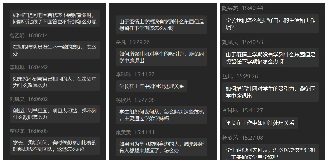 活动中,分享者主要通过学习方法分享、社团组织工作、竞赛团队组建、创业计划撰写等方面详细展开。第一位分享人,2019年“校长荣誉奖”获得者王琦,向观众介绍有效学习的方法以及制定学习计划的经验。她认为,明确自身目标是首要任务,将大目标细分为多个小目标,逐个实现,再加以不懈努力,就会离自己的大目标逐渐靠近。随后,建筑模型协会会长杨航分享了在社团工作中的心得,他强调合理运用“四象限法则”,可以将自身在工作与生活之间所遇到的事进行轻重缓急的划分,有助于解决时间分配的问题。“第五届互联网+创新创业大赛”重庆市银奖获得者曹廷炳,主要从竞赛团队的组建及项目计划撰写两个方面进行分享。他认为专业团队多元化、团队组成专业化、工作运营明晰化是竞赛团队组成的关键;完整的结构和突出的重点是创业计划书的核心。三位分享嘉宾在评论区与观众进行线上交流问答,直播间的各位观众踊跃参与,气氛活跃。在三位分享人饱含知识经验的分享之后,来自M魔方社的罗宇给观众带来多种类型魔方的精彩表演,收获好评连连。