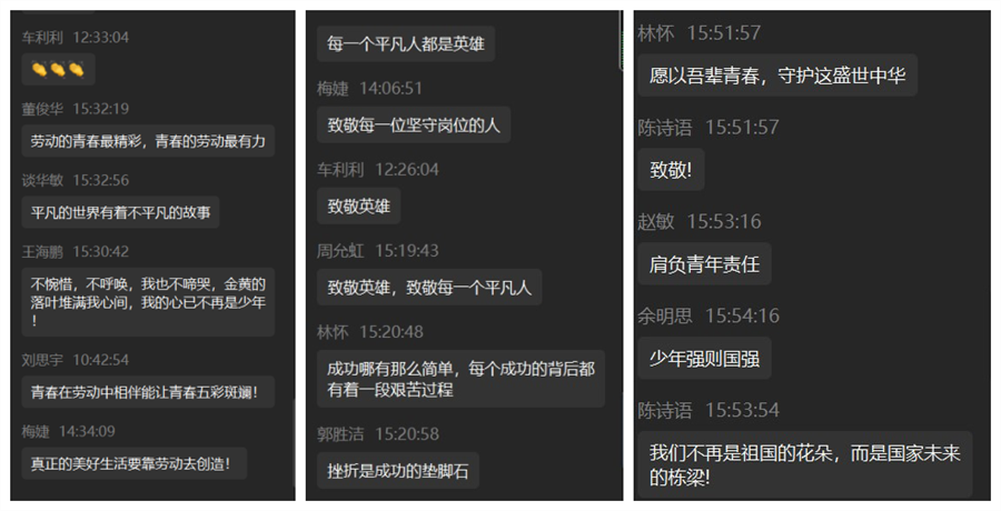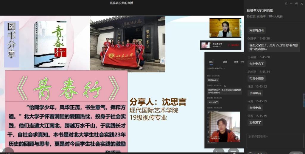 活动以一段《实励派》短视频拉开帷幕,视频讲述了电台主持人、急症医生、出租车司机等每一位平凡又伟大的劳动者,他们用辛勤劳动默默在黑夜中奉献自己,创造中国奇迹。同学们深受感动,纷纷在评论区留言,致敬每一位坚守岗位,不辱平凡的“实励派”。紧接着,来自国际商学院的吴思洁同学分享图书《风雨哈佛路》。她以书籍主人公丽玆从泥潭中走出并改变命运的故事分享了在追梦路上微笑面对挫折,坚强面对苦难的感悟。随后,来自数学与统计学院的陈诗语同学带来书籍《平凡的世界》,她通过讲述主人公自强不息,依靠自己的顽强毅力与命运抗争的故事告诉大家读书与劳动的重要性,并指出学习是通往理想的桥梁,青春在劳动中五彩斑斓。最后,来自现代国际设计艺术学院的沈思言同学分享了《青春行》。他表示,青春是探索、研究与实践,青春就应在社会实践中增强才干,绽放自己,展现风华正茂。每一位分享人都带来自己在阅读中最深切的感悟,引发同学们的思考与共鸣。最后,同学们分享自己在社会实践中的经历,这些经历中有感动,有曲折,有喜悦,这都是青春成长旅途中的别样风采。