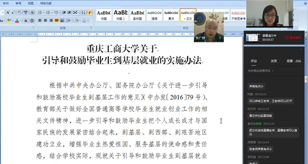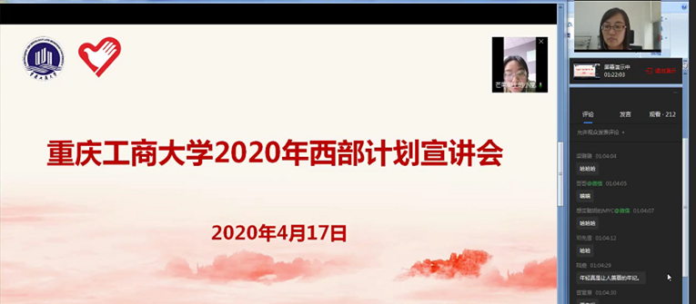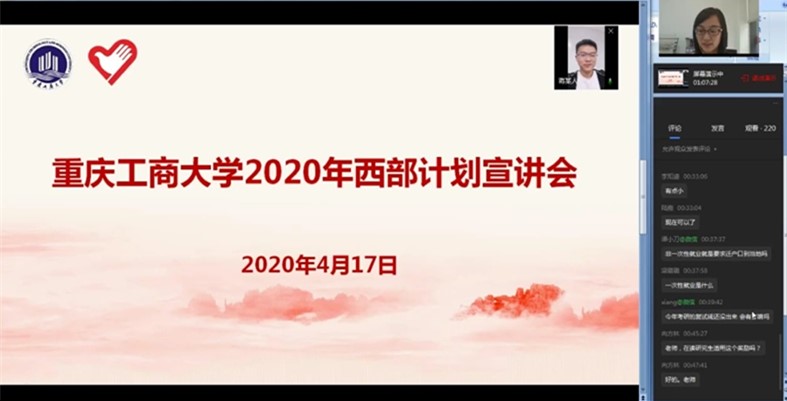 会上,校团委王微老师传达了全国项目办关于2020招募工作正式启动的相关内容和要求,同时部署了我校西部计划的工作安排。针对报名途径、审核流程、投递简历的方式和技巧、工作内容、福利待遇等进行了解读。招就处张广禄老师介绍了学校对于基层就业奖励的政策、申请流程及相关要求。来自重庆开州的西部计划志愿者2019届毕业生蒋超、来自新疆建设兵团十二师的西部计划志愿者2019届毕业生舒维维也来到直播间与同学们进行了交流分享。他们分享了自己参与西部计划的初衷、现任岗位的工作情况、参与西部计划的收获和未来的打算。他们扎根基层,服务人民的初心和故事感染和鼓舞了在场的每一个人。最后,校团委针对同学们存在的问题一一进行了答疑解惑。