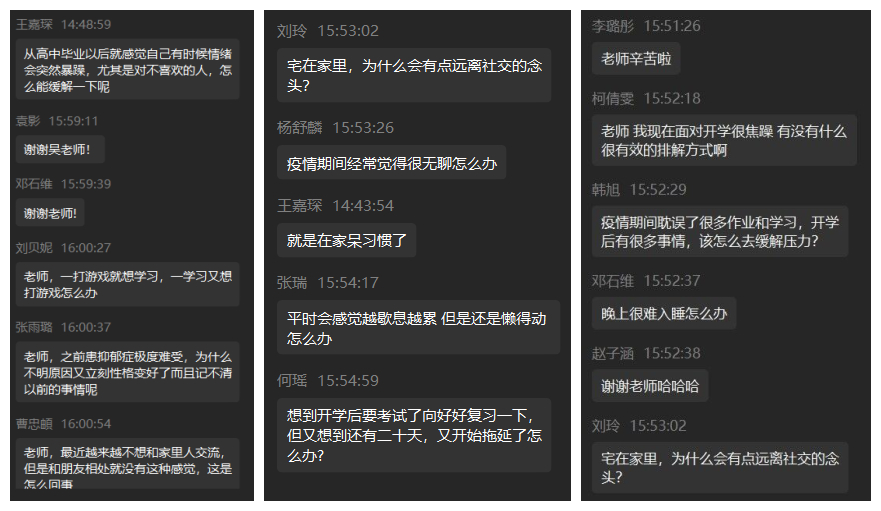 为调整学生疫情期间返校心态,引导学生构建正确的心理观念,5月8日15:00,由校团委主办、校学生会承办的第九期“工商青年说”在企业微信平台顺利举行。本期活动以“返校在即,你的‘心’准备好了吗”为主题,我校青年教师、心理健康与咨询中心咨询师、国家二级心理咨询师吴骕騻主讲,就如何调节心理状态,积极开启疫情防控下的校园生活等问题与200余名同学进行线上分享。