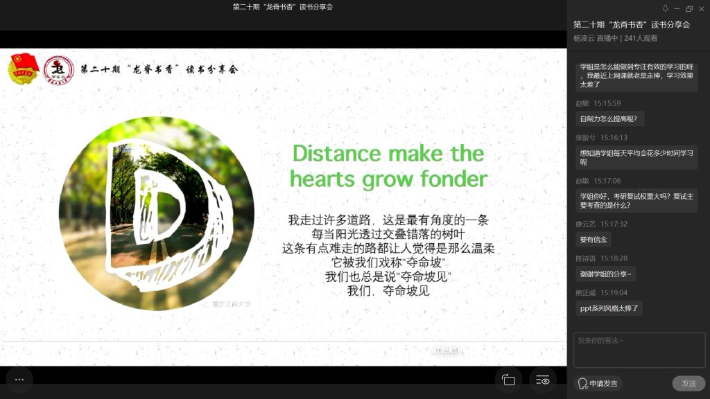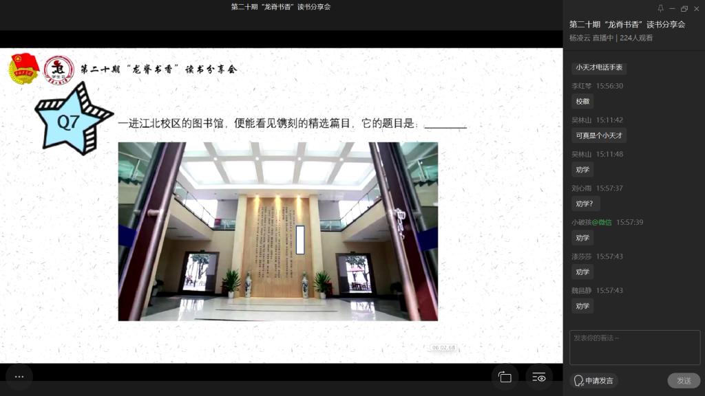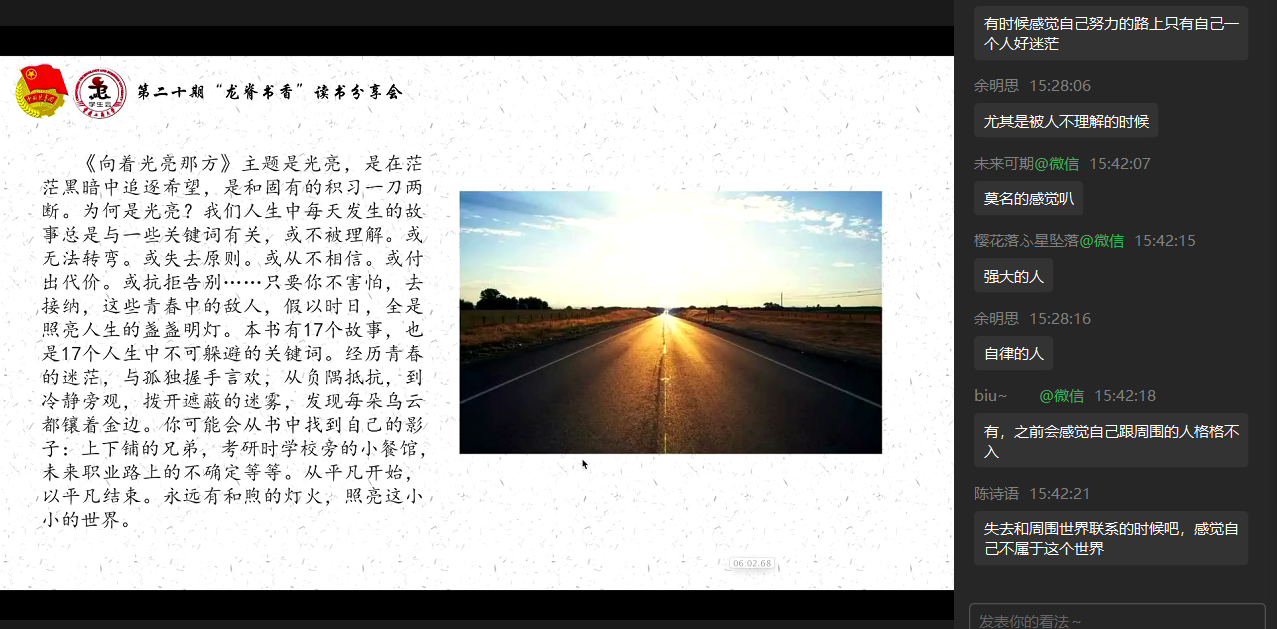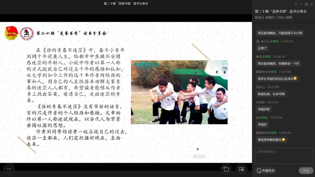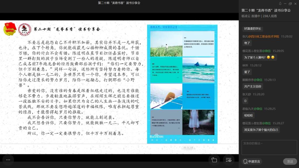 5月29日,由校团委主办,校学生会承办的第二十期“龙脊书香”读书分享会在企业微信平台成功举办。本期分享会以“励志青春,扬帆起航”为主题,200多名观众一起观看直播,分享青春的美好和拼搏。