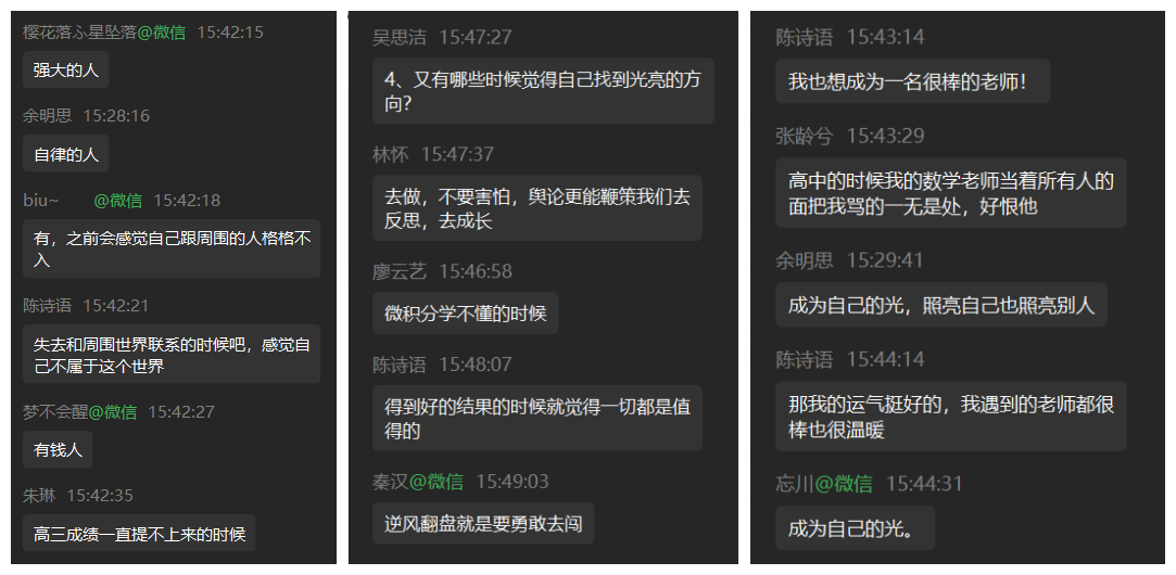 本次活动旨在帮同学们正视过去,走出迷茫,把握现在,直面未来;每一位分享人带来的故事都引发同学们的共鸣。相信在以后的生活和学习中,同学们会时刻提醒自己青春的真正意义并向着光亮方向,扬帆起航。