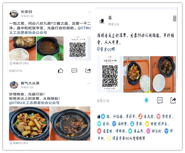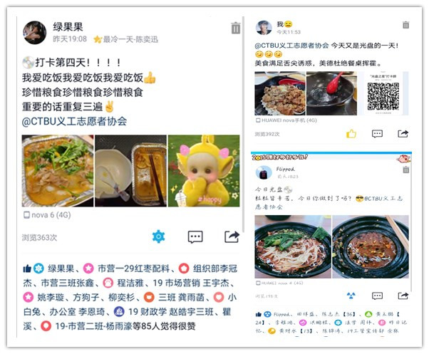 9月14日,“光盘之星”打卡活动正式开始。活动得到同学们的积极响应,活动当天就有百余名学生加入进来,通过发布餐前和餐后光盘的对比照片,编辑“光盘宣言”即可参与打卡,连续14天打卡的同学,可以有机会获得“光盘之星”称号。本周,校义协还将陆续推出“寻找光盘先锋行动”、“光盘主题宣言征集活动”、“光盘行动主题海报设计大赛”,通过线上线下形式多样的活动,号召全校学生懂得珍惜粮食,厉行节约,从每餐“光盘行动”开始,用“小餐桌”带动“大文明”。