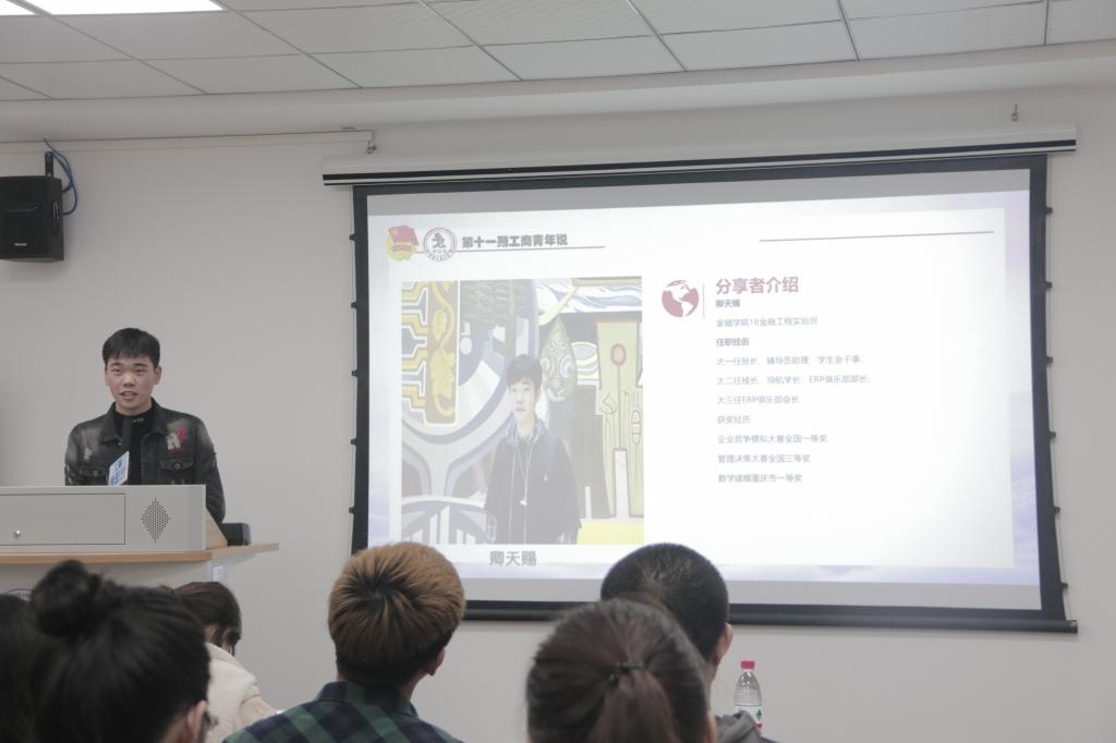 活动伊始,同学们共同观看由苹果创始人乔布斯送给斯坦福毕业大学生的演讲视频。随后,第一位分享人唐芳为大家分享多个可以提高学习效率和生活自律的APP,并以“课堂学习”和“课外学习”为重点,介绍多种有效的学习方法。第二位分享人阚卓凡为同学们分享她的多次比赛经验,她以“创新创业学分、荣誉称号、能力提升”为主题,让现场同学们理解到积极参加比赛和进行团队合作交流的重要性。第三位分享人ERP俱乐部的会长卿天赐为同学们讲述他在社团的工作经历、和付出与收获后的想法感悟,他认为“无论做什么都应认真对待、付出”,通过他的讲解,同学们对生活中的态度有了更加深刻的体会和新的认识。