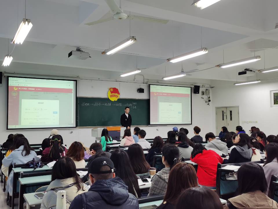 本次培训大会以讲座形式开展。大会开始之前,工作人员发放高校团支部书记工作指南供各班团支书学习和参考。会议伊始,王海鹏向参会人员阐述本次培训的目的和意义,并强调团干部应该端正自己的态度,提高政治意识,树立终生学习的观念。紧接着,王海鹏就“发展团员”、“智慧团建”、“对标定级”、“评选办法”四个板块展开了详细的解说,并提出有关团日活动的一些经验,展示以往班级的优秀团日成果。随后,陈琛老师上台进行总结补充,并当面耐心解答各团支书在工作中遇到的问题。此外,王海鹏向大家系统的介绍了共青团的光辉历史、性质和任务,让大家更加了解作为团支书的责任和义务,明确服务学校和广大师生的必要性和重要性。